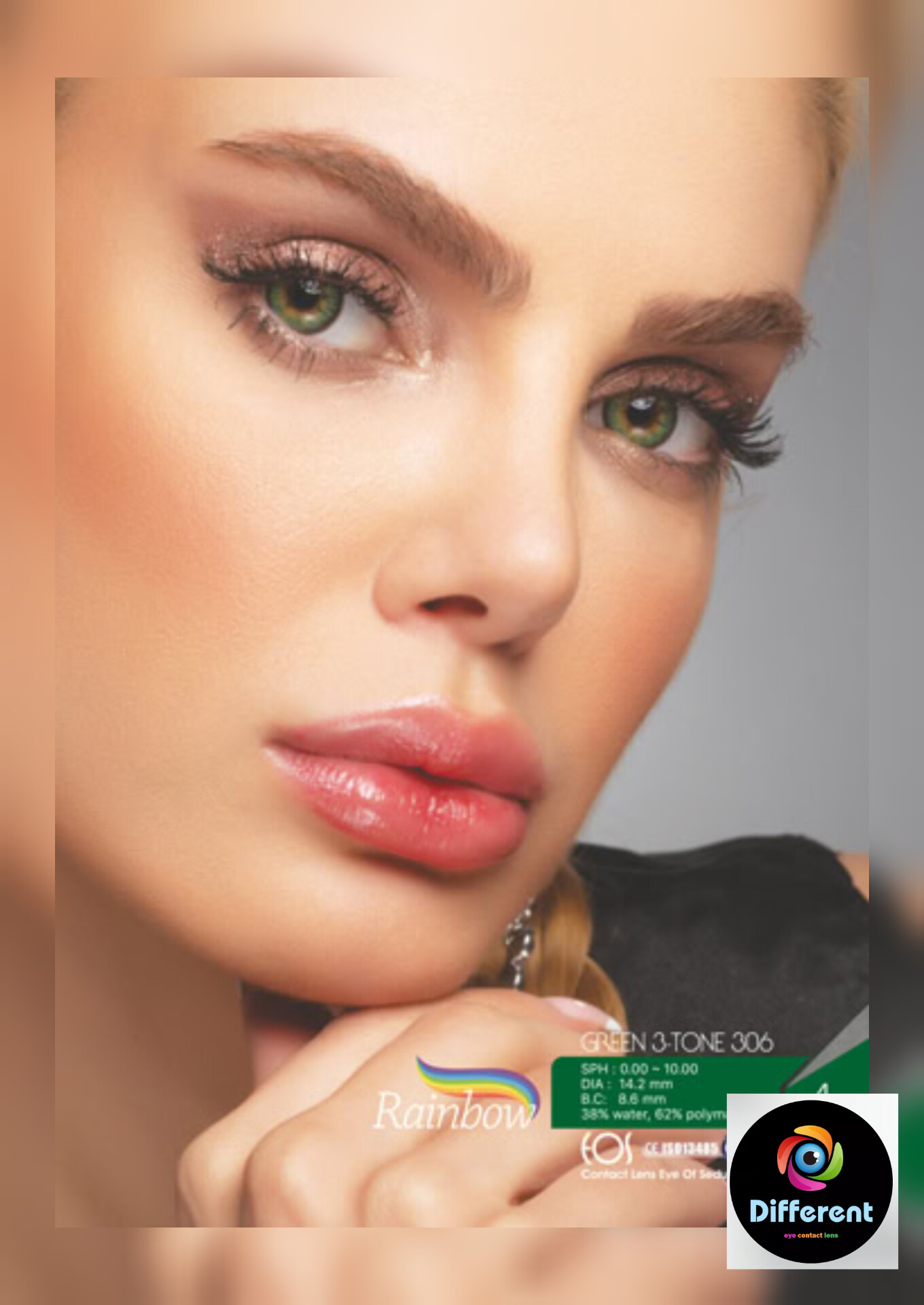برند : رینبو (rain bow) مدل : گرین306 (green 306) رنگ : سبز عسلی انحنا لنز : 8.6 قطر لنز : 14.2 مدت زمان استفاده : فصلی نوع لنز : رنگی غیر طبی، طبی آب رسانی : 42.5%