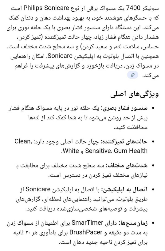 سونیکر 7400 یک مسواک برقی از نوع Philips Sonicare است که با حسگرهای هوشمند خود، به بهبود بهداشت دهان و دندان کمک میکند. این دستگاه دارای سنسور فشار بصری با یک حلقه نوری برای هشدار دادن هنگام فشار زیاد، چهار حالت تمیزکننده (تمیز کردن، حساس، سلامت لثه، و سفید کردن) و سه سطح شدت مختلف است. همچنین با اتصال بلوتوث به اپلیکیشن Sonicare، امکان راهنمایی در مسواک زدن، دریافت بازخورد و گزارشهای پیشرفت را فراهم میکند.