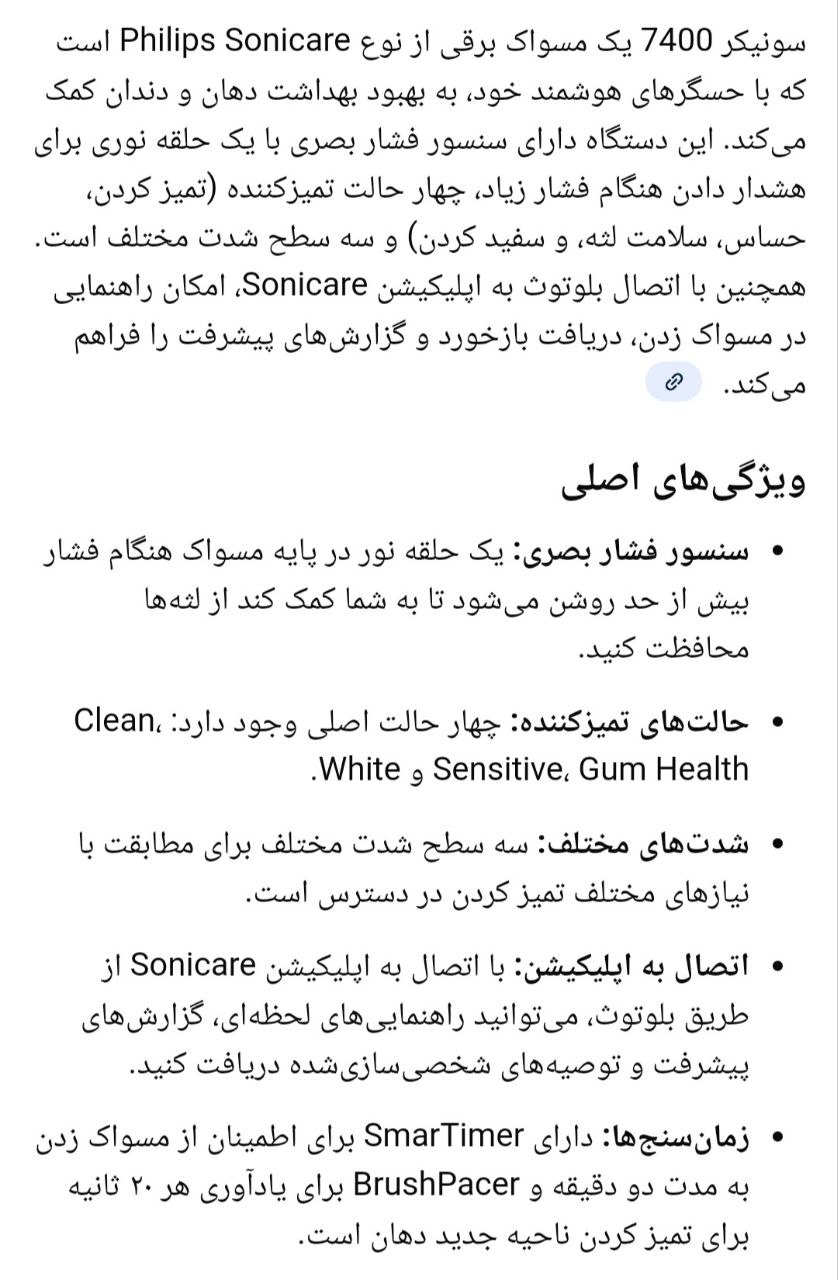 سونیکر 7400 یک مسواک برقی از نوع Philips Sonicare است که با حسگرهای هوشمند خود، به بهبود بهداشت دهان و دندان کمک میکند. این دستگاه دارای سنسور فشار بصری با یک حلقه نوری برای هشدار دادن هنگام فشار زیاد، چهار حالت تمیزکننده (تمیز کردن، حساس، سلامت لثه، و سفید کردن) و سه سطح شدت مختلف است. همچنین با اتصال بلوتوث به اپلیکیشن Sonicare، امکان راهنمایی در مسواک زدن، دریافت بازخورد و گزارشهای پیشرفت را فراهم میکند.